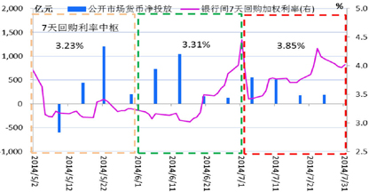 1.降低企业融资成本需要保证充裕的资金供给。7月16日,李克强主持召开国务院常务会议,会议强调全年主要目标“必须保证完成”,强调“以经济建设为中心,把发展作为第一要务”。7月23日,李克强总理主持召开国务院常务会议,部署十大举措,以缓解企业融资成本高问题。李克强指出,要出台几项“硬措施”,争取融资成本年内有所降低。为稳增长,降低企业融资成本仍是下半年的主要政策目标,这需要保证银行间市场的流动性充裕,降低资金成本。