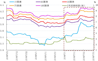 7月资金面较6月偏紧,7天回购利率月度中枢为3.85%,较6月上升53bps,高于市场预期。资金利率的上行主要由于银行存款准备金增缴,月度增值税、营业税等常规税费和季度企业所得税的征收,以及股市IPO的密集发行。央行在21-25日当周暂停了所有公开市场操作,保障资金的稳定供给,随后资金利率有所回落。(图2)