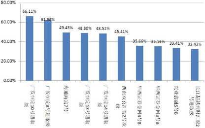 从表现最好的产品收益情况看,排名前十的产品收益都在20.00%以上,较上月有较大提高,最高收益达到30.94%。值得引起注意的是,进入前十的产品有两款债券型,在股市结构性行情出现的情况下,这很难得。(图10)