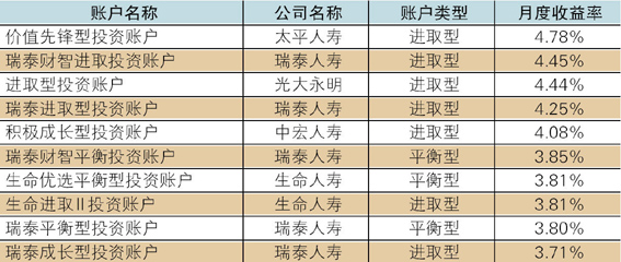 本月共有167个获得正收益率,其中包括保守型32个、稳健型54个、平衡型38个、进取型43个。以上四类投资账户的月度平均收益率依次为0.37%、0.88%、1.48%和1.51%。月度收益表现最好的10个投资账户中,进取型7个,平衡型3个,排名首位的是太平人寿的价值先锋型投资账户。(表2)