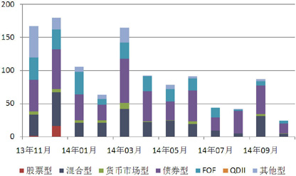 本月,7家证券公司或其资管公司共发行了24款券商集合理财产品,环比减少63款,降幅72.41%,平均首发目标规模10.18亿元,环比减少1.07亿元,降幅9.49%;债券型产品发行了15款,环比减少28款,降幅65.12%,平均首发目标规模10.75亿元,环比上升1.04亿元,增幅10.75%;混合型产品发行了4款,环比减少27款,降幅87.10%,平均首发目标规模1.53亿元,环比减少9.25亿元,降幅85.84%;FOF产品发行了4款,环比减少3款,降幅42.86%,平均首发目标规模0.80亿元,环比减少0.28亿元,降幅26.06%;货币市场型产品发行了1款,环比减少2款,降幅66.67%,平均首发目标规模50.00亿元,环比持平。(图9)