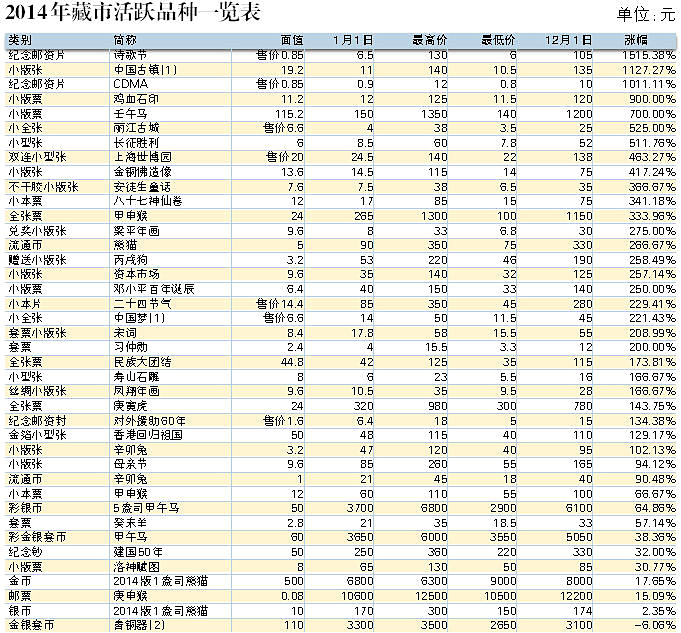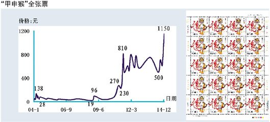 表现一直低迷的小本票板块,在2014年下半年也现萌动,一些近年来发行的新品种在买盘吸纳下呈扬升态势,其中不少品种涨幅同样不小。如“八十七神仙卷”小本票价格从年初的15元攀升到12月中旬的65元,“七仙女”、“刘三姐”、“牛郎织女”、“白娘子”和“神舟载人飞船”分别上扬到22元、25元、20元、30元和60元。