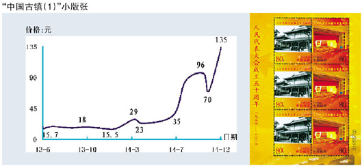 至于挂牌品种的表现就更加令人惊叹,像“中国古镇(1)”小版张价格从年初跌破面值的11元飙升到135元,11倍升幅让人惊叹不已,“金铜佛造像”小版张由年初的14.5元狂涨至75元,涨幅为3.2倍,而2004年发行的“人大”小版张则从20元暴涨到280元,14倍的升幅同样令投资者大跌眼镜,2003年发行的“晋祠彩塑”小版张也从95元攀高至500元,纯涨幅高达4倍余。
