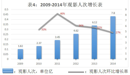 从观影人次增幅来看,虽然自2010 年达到的高峰期之后,呈现缓慢下降趋势,但今年在影院以及银幕数继续快速增加的市场背景下,观影人次增幅还是超过13年。当然,随着硬件设施建设和增长的趋缓,硬件条件增长带来的观影人群涨幅也势必将会日渐缩小。接下来,中国的电影行业将在平稳、匀速的状态下运行一段时期。但是平稳时期对于一个一直在超高速发展的后发新兴市场来说,对于这市场中的很多几年来持续收获高额利润的从业企业来说,即是遇到了发展的瓶颈期了。这种“瓶颈”给中国电影产业的发展带来了许多变数,而这些变数共同作用的结果便是形成了行业的新常态。具体变化见表2、3、4。
