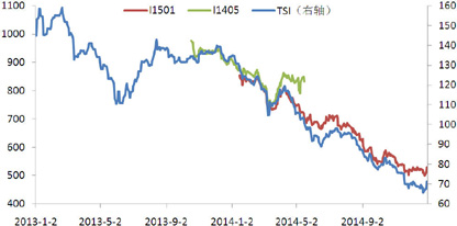 中国大连商品交易所铁矿石期货与TSI的走势高度相关,以I1501合约为例,1月16日为该合约首个交易日的收盘价为853元/吨,此后铁矿石I1501期货合约价格持续震荡下行,并于4月中旬至6月中旬、8月中旬至9月底期间加速下跌,四季度呈现弱势震荡格局,年底收盘于526元/吨,下跌38.33%。