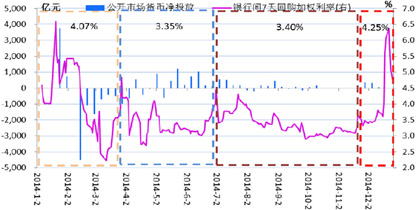 预计2015年的资金面仍将维持整体宽松的格局,全年的回购中枢将继续下移,央行仍将通过公开市场操作以及MLF、SLO、PSL等多种政策工具呵护资金面,全年资金的波动性也将有所降低。而且随着美元走强外汇占款减少,通胀压力显著降低,存款保险制度正式推出,央行使用更长期的政策工具向市场提供流动性的动力也在增强,全面降准的可能性仍然存在,但时点和力度存在不确定性。2014年年末的降息对于社会融资成本下降的引导作用仍然不太显著,央行再次降息的可能性也不能排除。另一方面资金面可能受到阶段性地受到包括节假日取现、税收集中上缴、新股IPO、年末季末时点效应等负面因素的冲击出现阶段性紧张,仍须引起注意。