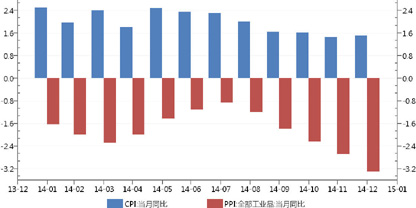 2015年,中国经济仍将受到增长速度换挡期、结构调整阵痛期和前期刺激政策消化期的“三期叠加”影响,宏观经济仍然面临较大下行压力。从已经公布的最新PMI、CPI、工业增加值、社会融资总额等经济金融数据看,尚未出现明显复苏信号,降低社会融资成本仍将是重要的政策目标。2014年年底召开的中央经济工作会议提出“积极的财政政策要有力度,货币政策要更加注重松紧适度”,更多的政策宽松措施值得期待。