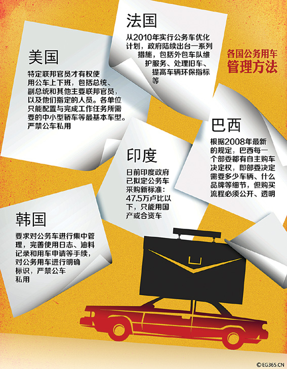 有政府就有公车。如何控制公务用车总量?如何防范公车私用?如何惩处违规使用公车的相关人员?看看国外的一些做法。美国明确规定,政府所有或租赁的车辆,只能用于公务。违规使用公车者,将被处至少停职一个月,甚至解职的处罚。法国公务员人数众多,公务车队伍也十分庞大,目前法国政府已经建立起一套科学的公务车管理系统,计划在未来打破各部门各管各车的现状,实施公务车辆统一管理调配,实现车辆的跨部门服务。韩国公务用车的管理机关是安全行政部,韩国虽然没有对公务用车专门立法,但是有《公用车辆管理规定》的总统令。