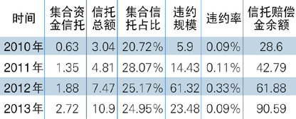 注:集合资金信托、信托综合的单位为万亿,违约规模和信托赔偿金余额单位为亿元,其中违约规模=附表中以到期日为统计口径的募集资金的二分之一。