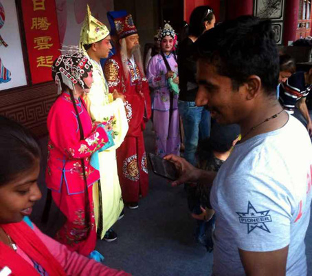 农历三月十五,云南大理三月街,电影《五朵金花》里有介绍,是当地传统的物资交流、文化交流、体育交流的活动。今年,盛况依然,人山人海,上午赛马刚结束,下午的演出又开始,两名外国留学生情侣显然对中国戏剧产生兴趣,左拍右拍。旁边的少数民族女孩对对外国女孩的服装感兴趣,邀请她合影,古今中外同图。三月街的重头戏是商贸,各地商贾云集练摊,有买有卖,有凑热闹闲逛的。今年,也加强了安保,人群密集,大意不得。 公孙欠谀/图文
