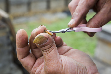每个蜂群中的蜂王要花上二、三年的时间进行优选,脾气和顺、产卵率高的蜂王才会被保留下来。张传谦手中小心捏着的是今年新选的蜂王,怕它意外飞走,正剪去它一边的半只翅膀。
