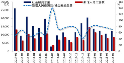 自2月以来,财政存款呈现回笼规模低于季节性,而投放规模高于季节性的特点。截至2014年底,财政支出12个月累计滚动额约在15.1万亿元,今年5月末升至15.8万亿元;相应12个月滚动累计赤字规模约在1.1万亿元,今年5月末升至1.4万亿元。今年4月更是出现全国公共财政支出同比大增逾三成的情况,令市场猜测财政政策或已由实质上的紧缩转向宽松。