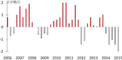 从全球原油供需格局看,2015年1季度供给超出需求近200万桶/日,且已是连续第五个季度供给大于需求,供给溢出的时间长度和数量幅度均为近十多年来最大水平。