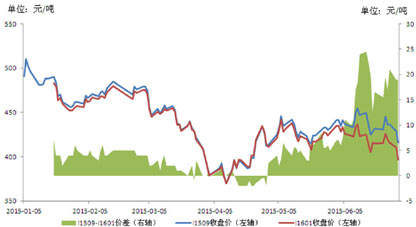 国内大连商品交易所铁矿石期货②经历了两轮活跃合约的转换,1月合约和5月合约先后完成交割。目前的活跃合约和次活跃合约换至1509合约和1601合约,近月合约I1509对远月合约I1601呈溢价状态。5月中旬前,近月和远月的跨月价差基本持稳,但5月中旬后,近月合约对远月合约的溢价明显拉宽,并在6月中下旬TSI升至二季度高位后一度拉宽至25元/吨左右。截至6月30日,1509合约和1601合约分别收报416元/吨和397元/吨。(图7)