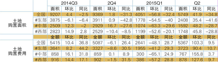 表2 2014Q3-2015Q2土地购置面积及费用情况 单位:万平方米、亿元,%