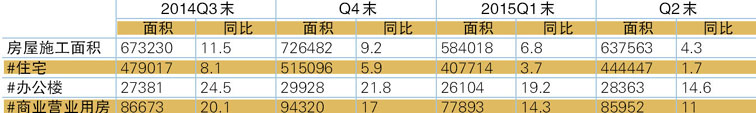 表4 2014Q3末-2015Q2末房屋在建施工面积情况 单位:万平方米,%