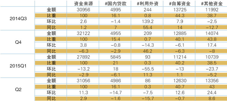 表6 2014Q3-2015Q2开发企业资金来源情况 单位:亿元、%