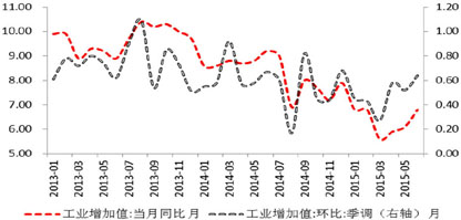 增长:(1)工业:近期工业增加值小幅反弹,但仍在低位运行。工业产出的核心依旧在房地产领域,当前商品房销售正在改善,但库存压力仍较大,企业拿地和新开工意愿不强,建筑钢材销售持续低迷,短期房地产行业难有显著反弹,因此工业产出仍有下降压力。(2)投资:单月增速回升显示固定资产投资有所企稳。反弹主要来自基建投资支撑,但基建投资资金约束仍在强化,进一步增长空间有限。(3)消费:消费有所改善但仍处于低位。随着股市下跌的财富再分配效应显现,居民消费可能受到较大负面影响,消费继续保持弱势的可能性偏大。(4)进出口:外需有所企稳,内需延续疲弱。发达经济体复苏加快带来外需弱势改善,但人民币实际有效汇率偏强仍在抑制整体出口的改善。进口的改善,则主要与大宗商品跌价带来的进口规模大幅反弹有关。但内需总体偏弱情况下,大宗商品进口库存的回升将抑制国内同类产品价格。而在股市降杠杆后,未来国内可持续加杠杆的主体经济部门或不足,内需疲弱难以改善,相应进口或继续低迷。