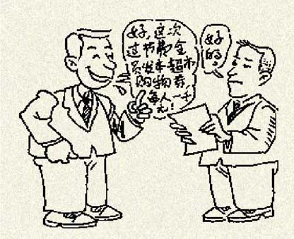 后来,王二的超市规模越来越大,这种购物券慢慢开始流通到了社会上。市面上还出现了个小黑市,专门从事兑换购物券的生意。