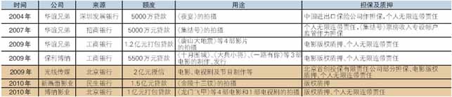 但从实际情况来看,我国电影商业化的过程中,从银行获得资金支持的情况还比较少见,原因主要在于:一是,影片制作公司的资产主要表现为无形的文化作品,很难进行价值评估和抵押设定。拥有合适的抵押品是获得银行贷款的重要条件,而抵押品的缺乏使得电影制作公司很难从银行获得资金支持。二是,从银行的角度看,虽然我国电影市场规模扩张很快,但是总体还比较小,加上缺乏抵押品,产业单笔贷款规模也较小,所以银行缺乏开展电影制作贷款的积极性。三是,电影审查面临的不确定性很大,增加了贷款的风险,公映作品的审查制度非常严格,一个电影作品如果最终不能通过审查,前期投入即付诸东流。四是,虽然银行正在逐渐开放对于电影项目的贷款投资,但选择银行贷款的电影项目以少数实力雄厚的大型影视公司的大型投资项目为主,企业还款能力强弱成为关键。