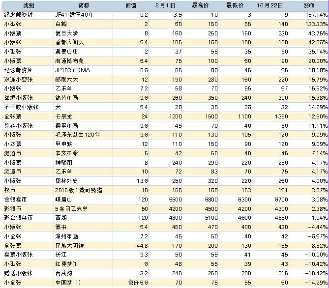 中国邮政为“抗日战争胜利70年”同样发行量一系列邮品,邮票、小版张、小型张和邮资封片简均同步发行,令市场集邮者喜上眉梢,也使得市场热点聚焦于这些新发行的邮品上,高开高走在所难免。截止到10月20日,“抗日战争胜利70周年”全张票、小版张和小型张分别高悬在230元、50元和20元,纪念邮资封、纪念邮资片和纪念邮资邮简则分别在3.5元、4元和2.5元附近交易。