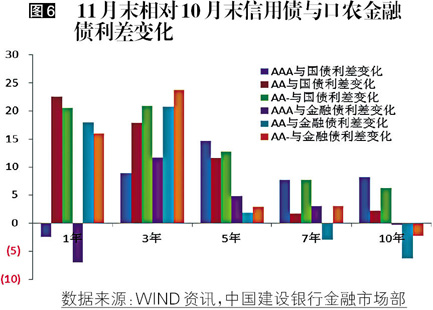 一级市场方面,11月份利率债共发行约12308亿元,较上月增加约3975亿元;净供给量约为10429亿元,较上月增加约3996亿元。二级市场方面,11月国债收益率曲线平坦化上行,主要原因一是IPO重启带动市场风险偏好上升,市场止盈压力有所释放;二是11月债券净供给有较明显的增加,也对收益率下行构成一定制约。不过由于11月公布的各项经济金融数据仍然疲弱,且除IPO重启外也看不到太多利空因素,因此市场对收益率的反弹也较为谨慎,仅短端收益率出现明显反弹,中长期反弹幅度较小。(图5)