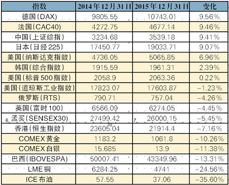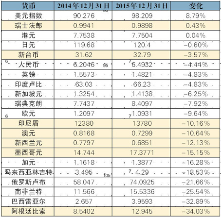 按:2015年,金融市场可以用动荡起伏来形容。外汇市场强势美元高涨,股票市场价格下行较普遍,石油市场指标低迷超预期,黄金受强势美元打压避险作用淡化,利率市场则因美联储最终决定导致全球政策分化明显。上述变化反映在图表上则更为直观。