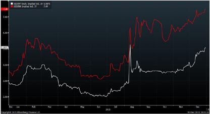 2015年USDCNY隐含波动率呈先涨后跌再震荡上涨的走势。年初USDCNY即期走高,避险情绪升温,推动1年期平价期权隐含波动率最高上涨至4.2%。3月后USDCNY即期迅速下跌并保持稳定,现货的波动变小导致波动率迅速下降;三季度初在客户买盘的支撑下,1年期隐含波动率企稳反弹;811汇改再次引发避险情绪,1年期隐含波动率跳涨至4.8%的水平后回落;随后市场进入震荡上涨走势,最高达到5.2%的历史高位。