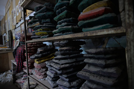 “不行。”尹师傅停下手中的活儿回答说:“这是祖祖辈辈沿袭下来的,包括一些模板,都是老辈留下来的,宁简勿繁,这就是传统木版年画的特色。”尹师傅同时也提出了他自己的看法:“发展朱仙镇木版年画,首先应该尊重原版。朱仙镇木版年画的特色就在于线条粗犷,人物形象夸张、饱满,还有就是纯植物熬制的颜料,全部都是沿用的传统工艺。如果一味追求精细化、批量化生产,会失去木版年画原有的味道。”