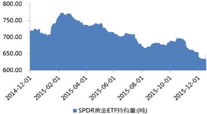 从投资需求分项来看,金条金币投资需求大幅上涨,第三季度金价下探期间,北美市场销量异常火爆,美国个人投资需求飙升至32.7吨,年同比增长超过200%。ETF投资需求持续放缓,2015 年世界最大的黄金ETF SPDR持有量其流出速度较2014年加快,其中7月和11月大幅流出,全年共减持66.65吨至642.37吨。(图4、表1)