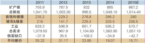 2015年全球白银供给和需求都出现萎缩,供需缺口预计将从2014年的34.8百万盎司(以下简称Moz)小幅扩大至42.7 Moz。(表2)