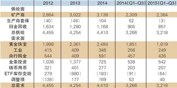 2015年一到三季度全球黄金总需求3,217.6吨,较2014年同期下滑1.49%。除投资需求外,其它各项黄金需求均下滑。2015年前三季度全球央行购金同比下滑6.75%至425.8吨,俄罗斯、中国等新兴经济体国家为主要买家。黄金首饰需求同比下滑1.73%至1,818.8吨,中国需求连续第二年表现疲弱,印度也受到恶劣天气影响,农户收入锐减购买力下降。工业需求下降2.61%至249.4吨,投资需求同比上涨5.29%至684.1吨。