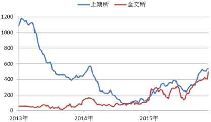 2015年全球白银库存变动表现为国外减少、国内增加,下半年尤其明显。COMEX白银库存从年初的175.54 Moz下降到160.67 Moz,总共减少14.87 Moz,约合462.51吨。而国内上期所和金交所的白银库存总和则从年初的235.19吨上升到1,033.16吨,总共增加797.97吨。