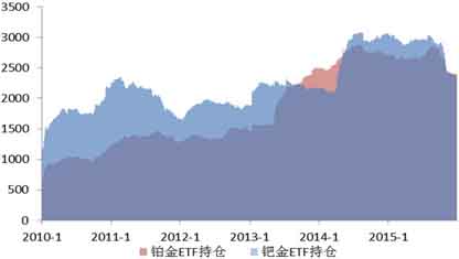 铂金ETF在2015年四季度较快出清成为净卖方,全年净流出0.332Moz,而2013、2014年分别净流入1.03、0.12Moz,2015年12月31日总持仓为2.39Moz。钯金ETF同样遭遇了净流出,2015年净流出为0.723Moz,较铂金ETF净流出更多,2015年12月31日总持仓为2.344Moz。(图10)