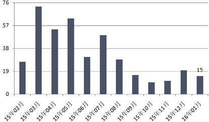 1月阳光私募发行数量录得15款,环比减少5款,仍处于低位。1月股市经历了“开门跌”,这本应对阳光私募发行构成一定影响,但从数据上看,这种影响并不明显。(图7)
