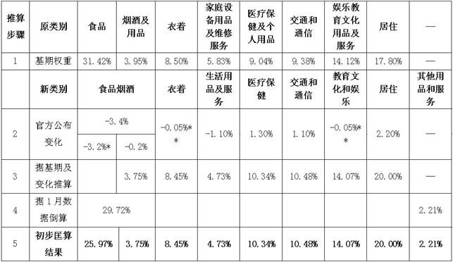 经计算,《国家统计局城市司负责人就CPI基期轮换接受中国信息报专访》一文中明确的各项权重增减变化之和为0.1%>0,故推测“权数变动相对较小”的其他分类,也即“衣着”和“教育文化和娱乐”两类,合计变动-0.1%,因缺乏更多信息,这里简单假设为“衣着”和“教育文化和娱乐”两类权重各下降0.05%。