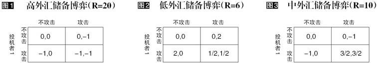 这个博弈模型是IMF首席经济学家Obstfeld(1986)提出的,虽然简单,但极具解释力。模型存在两个投机者,投机者根据一国中央银行的外汇储备情况制定自己的投机策略,假定投机者持有的资产为6单位。当一国中央银行持有的外汇储备很高为20单位时,投机者的支付矩阵见图1,可见有唯一均衡就是(不攻击,不攻击),因为即使两个投机者同时攻击该国货币,中央银行也能从容应对。当中央银行持有的外汇储备较低为6单位时,投机者只凭借自己的操作就可以使得货币贬值,获得收益。这时两个投机者都会选择攻击,那么也存在唯一均衡就是(攻击,攻击),见图2。但当中央银行的外汇储备处于中间状态,为10单位时,单个投机者的攻击不能使得货币贬值,这样就存在两个均衡(不攻击,不攻击),(攻击,攻击)。此时,当存在一个扰动,就是使得均衡从(不攻击,不攻击)转变为(攻击,攻击),则投机成功。