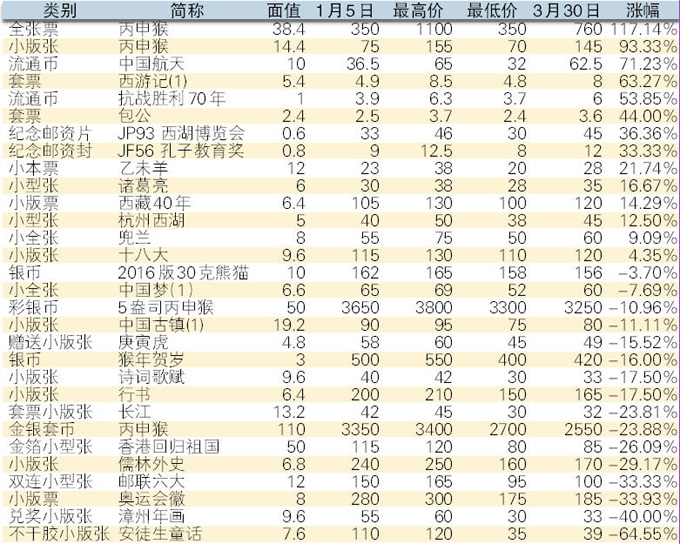 值得留意的是,2016年以来发行的新邮表现强势,截止到3月下旬已发行的4套新邮中,除了“中国邮政开办120年”套票跌破面值外,其他3套新邮均出现高于面值的较大溢幅现象,显示出新邮强势依旧。其中“丙申猴”套票、全张票、小版张和小本票的价格分别为19元、780元、145元和61元,“拜年(2)”套票和小版张分别在3.5元和38元成交,而“刘海粟作品选”全张票、套票和小版张则分别在220元、4.6元和53元交易,特别发行的缩量“中国邮政开办120年”小全张则在50元成交,也大幅高于发售价。