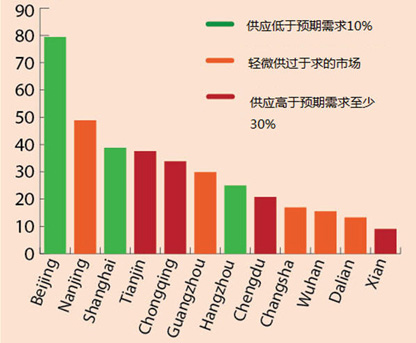 这种房价的增长是否会延续下去取决于不同城市供需的平衡。在报告中,他总结道,有20%的中国的一些主要城市,比如北京、杭州、上海和深圳,其供应“低于我们的预期需要”(在表二中这些城市的颜色以绿色标示);40%的城市,比如西安,其供应“至少有30%高于预期需求”;而剩下的40%属于“轻微供过于求”。