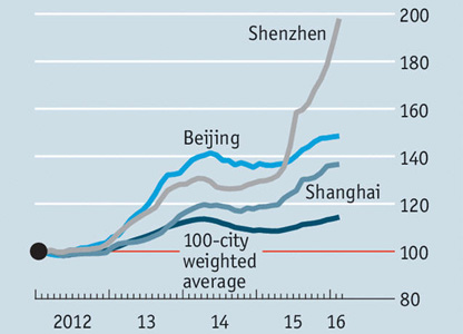 但遗憾的是,这种分而治之的房地产政策目前看来收效甚微。大城市房价飙涨的根源是央行在过去18月来逐步放宽的货币政策。尽管该政策的目的是为了拉动经济,但低利率不可避免地会拉升固定资产价格。一开始,银行释放的大部分信贷涌向了股市,然而经历了去年夏天的股灾之后,房地产成为了投资者们为数不多的上佳选择(资本管制最近也逐步收紧,这让中国人很难把他们的存款投资到境外市场)。