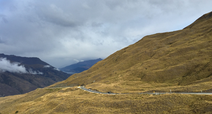 这条公路位于海拔1076米,建于1861年。两旁一片苍茫。离开Wanaka向南面山区行进,周围的风景渐渐改变了风格,不再是郁郁葱葱的绿色草原,色调变成末日荒凉般的金黄色。公路海拔渐渐升高,我们就在这满是荒草的山坡边盘旋,直到最高处的观景台,可以俯瞰来时的路。