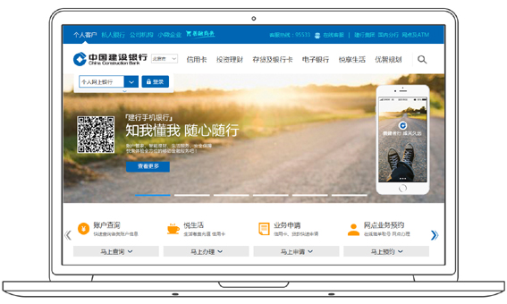 网站首页化“繁”为“简”,采用蓝、白、橙主色调搭配并大量运用场景图片,缩减页面篇幅,优化信息展示,整体视觉效果更佳。用户可通过首页顶部进入个人客户、公司机构、小微企业、私人银行、集团网站等专属服务页面;个人客户通过“快易金融”、“悦享生活”、“优智规划”楼层等可对建行业务有更加清晰直观了解;用户通过首页快速服务通道,能够快速办理账户查询、生活缴费、业务申请、网点预约等用户常用生活功能服务;同时利用宽频广告、图文并茂的场景设计、简洁明了的文字配置,给用户更亲切体验。