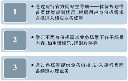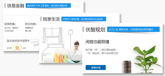 首先,用户可利用网站首页清晰楼层展示使用各项产品服务。如用户通过“优智规划”场景,可以学习如何规划校园生活、如何吃喝玩乐却能消而不费、怎样让留学创业后顾无忧,学习如何根据资金和时间限制选择投资产品、怎样更有技巧的理财和他人成功理财案例等;通过“快易金融”、“悦享生活”、“个性专属”聚焦金融/非金融生活点滴、管理个人中心,实现足不出户学习并完成投资理财、缴费支付、买房购物、资讯查询等金融与非金融服务。