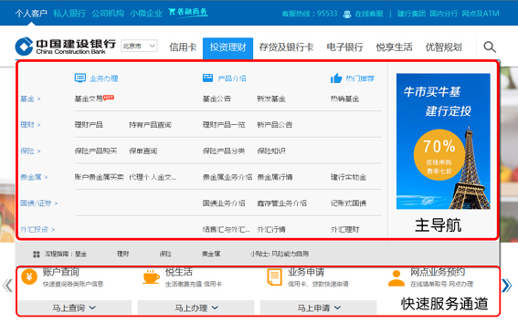 首先,新版网站操作界面简洁清晰,用户可快速定位和使用网站功能服务。如首页主导航变“简”为“精”,基于建行业务的系统化整理,根据产品服务属性和用户访问习惯依次划分信用卡、投资理财、存贷及银行卡、电子银行、悦享生活、优智规划等模块,并进一步对各模块划分业务办理、产品信息、热门推荐三个二级分类,便于用户一键直达目标页面。同时,网站在各个频道首页均设置快速服务通道,用户可实现投资理财、生活缴费、业务预约等日常高频业务快速办理,使得操作更加流畅、时间更加节省。