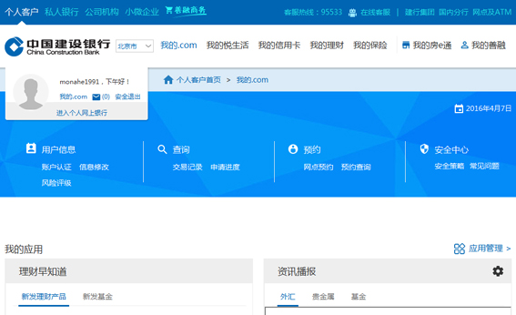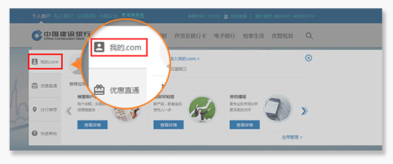 新版网站立足“以客户为中心”的服务理念,以用户需求为出发点,部署产品服务,新增“我的.com”模块,实现用户对个人信息的全方位管理,为不同用户更加精准的推送服务内容。一是用户无需进行网站注册,即可凭建行账户或建行网银账号直接登录“我的.com”享受各项服务,如个人专属应用服务定制、生活服务、优惠信息等;二是可统一管理个人信息,使用“交易记录查询”、“申请进度查询”、“网点预约”等服务;三是可直接进入“我的悦生活”、“我的信用卡”、“我的善融”、“我的理财”、“我的保险”等分用户中心;四是可查询用户本地的优惠服务信息,使用“服务指南”、“常见问题”、“理财计算器”、“产品决策器”等实用工具。
