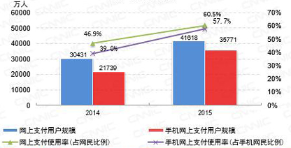 2014-2015年网上支付/手机网上支付用户规模及使用率