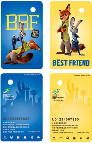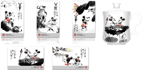 自然在上海交通中越来越重要的地铁卡上,同样不会缺少“迪士尼”明星们的靓影,且设计与切入的画面视角更加引人入胜。尤其是一套名为“水墨中国”的纪念地铁卡,采用了中国特有的民族传统水墨画形式,将迪士尼代表性卡通形象——米奇与米妮表现得惟妙惟肖,很好地赋予了迪士尼卡通造型中国风的元素,令人拍案叫绝,如此设计也体现了上海迪士尼乐园别具一格的特色,既是中西方文化的完美交融,也点明了与前面5家迪士尼乐园不一样的特色,并暗含了上海迪士尼的地理位置,意境高雅而含蓄,这套具有典型民族风格的地铁卡共5枚,售价90元,发行后受到集藏者欢迎是不言而喻的。而同时发行的“乐游上海”纪念地铁卡册将人们喜闻乐见的迪士尼卡通形象搬上地铁卡,并以主次分明的方式将迪士尼卡通明星展现在不同的6张画面上,具有典型的迪士尼风格,这套“乐游上海”纪念地铁卡售价100元。