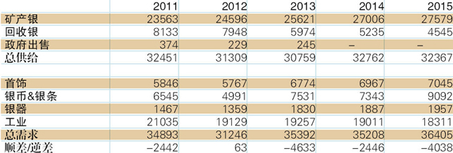 2015年全球白银供给缺口上涨65.2%至4,038吨,其中供给增长2.1%,需求增长3.4%。(表2)