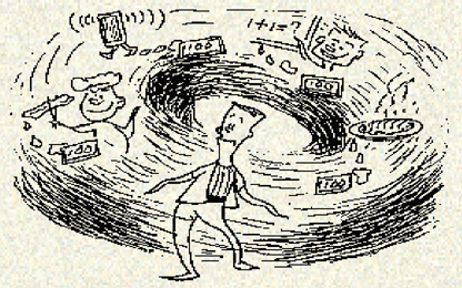 王二琢磨钱怎么就没了呢?道理显而易见:钱都被别人给赚走了。一日三餐、交通费、通讯费是生活必不可少的,自己偶尔再有点娱乐活动,自己的钱就这么没了。