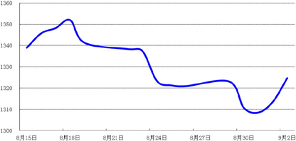 上周,国际金价先跌后涨:周初,因美联储官员就利率发表鹰派言论,提振美元,金价承压,一度触及近两个月低位;周五,因美国8月就业数据弱于预期,市场对美联储9月加息预期降温,金价跳升,收于1324.65美元/盎司,较前一周小幅上涨0.29%。